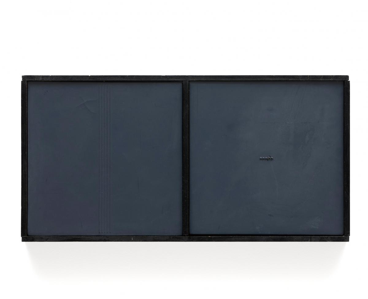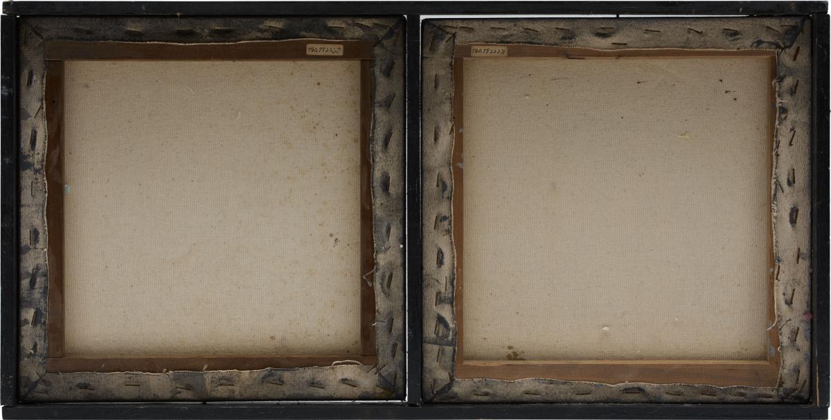 作品中央下部にサイン、制作年 右の作品上部に絵の具のひび割れがあり。 その他全体に擦れ、汚れの付着、カビの後がある。 作品に貼り付けられた球体の1つに塗料の剥がれがみられる。