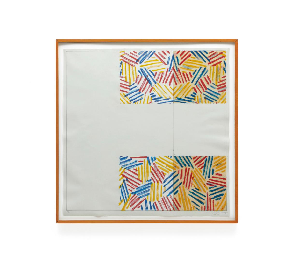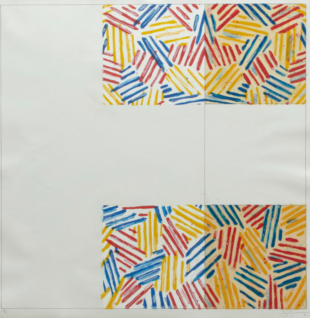 三原色のクロスハッチングを用いた作品。余白部分まで作品化している、版画のマージン(図版部分の周囲にある余白)も作品の一部とみなしていたジャスパー・ジョーンズらしい一枚。