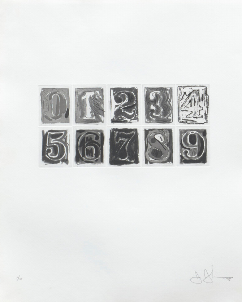 ジョーンズは数字作品の制作を行う際、反復の手間を避け、着彩作業などに専念するために梱包などに使われるステンシルで数字を描くことが多かった。