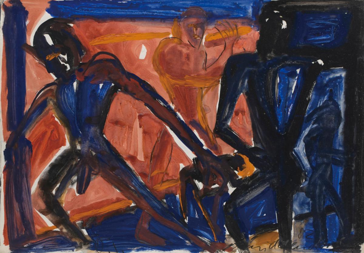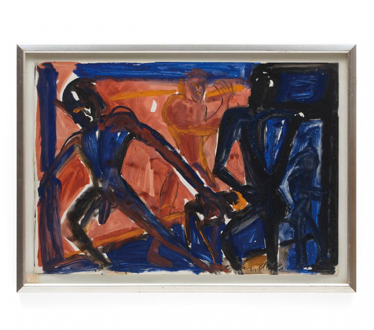 右下にサイン、制作年。 浮かせばりによる波打ちがあり、白地の部分に黄変とブラウンスポットあり。