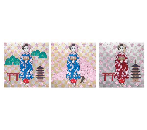 [1] Maiko in Springtime Kyoto [2] Maiko in Kyoto, Cherry Blossoms on Blue [3] Maiko of Kyoto, Cherry Blossoms on Red