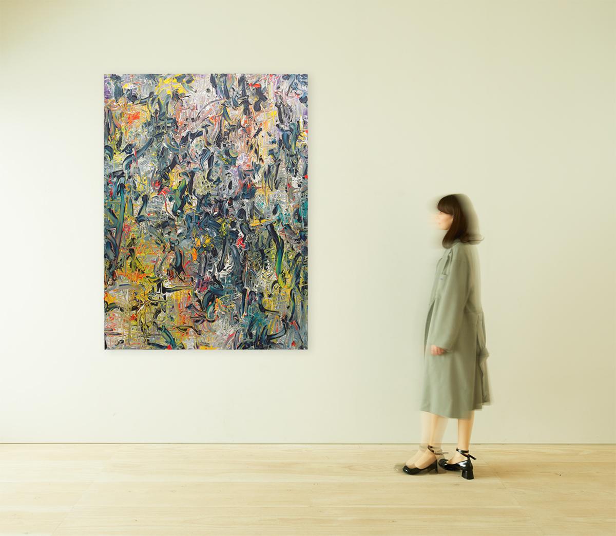 INAHAMI, an early representative work, embodies this pursuit. The rhythmic, undulating strokes and vivid colors unfold across the surface like waves, conveying the artist’s inner conflicts and emotional fluctuations with striking immediacy.
