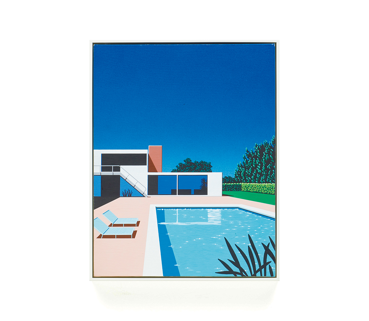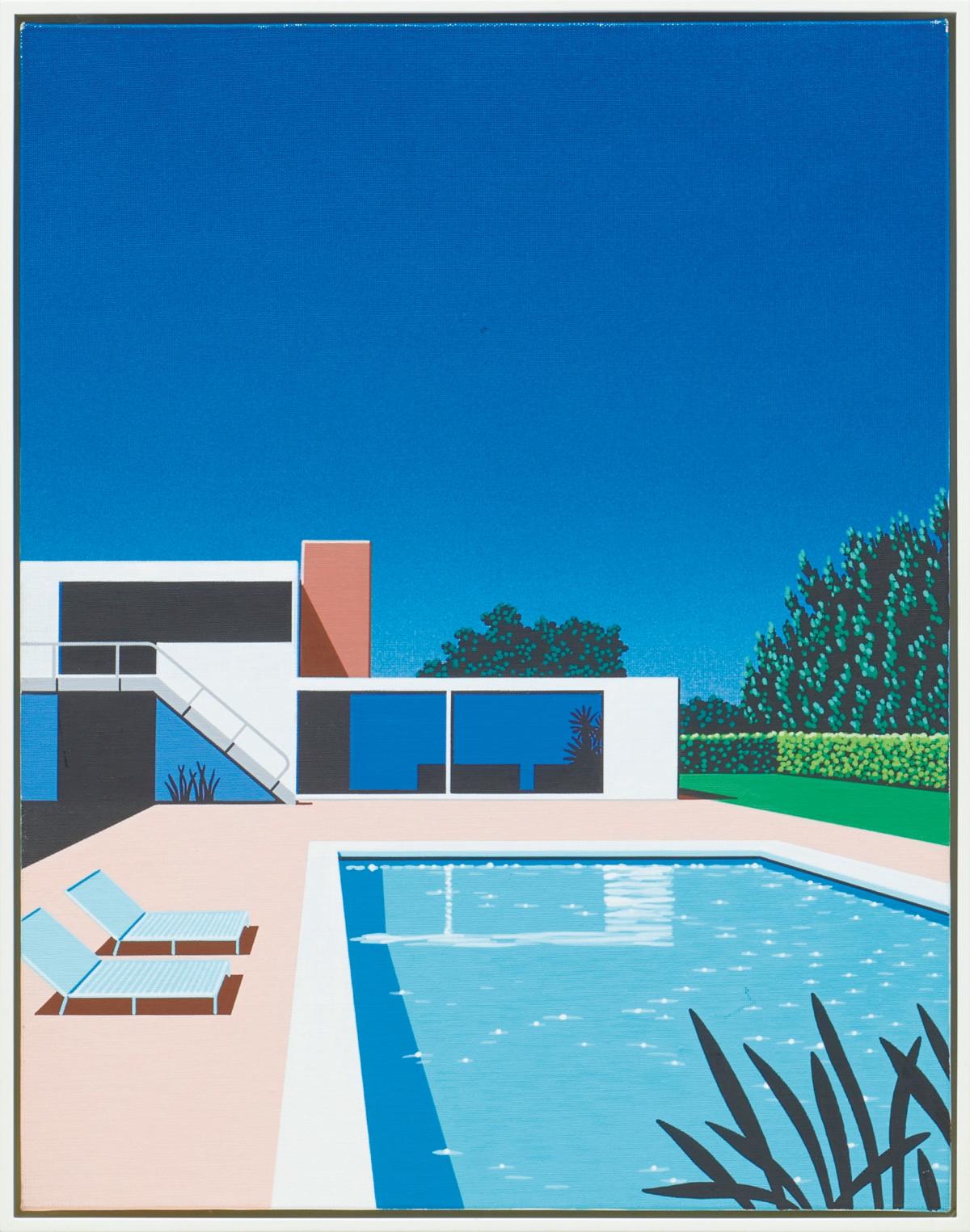 This work, created in 2000, is an acrylic painting measuring 41 × 32 cm. It depicts a serene vacation scene along a poolside beneath a brilliantly colored sky suggestive of the West Coast. From the 2000s onward, Nagai actively participated in art exhibitions, and this piece was produced during that period of transition, stands as a quintessential example of his enduring ability to evoke a sense of nostalgia.