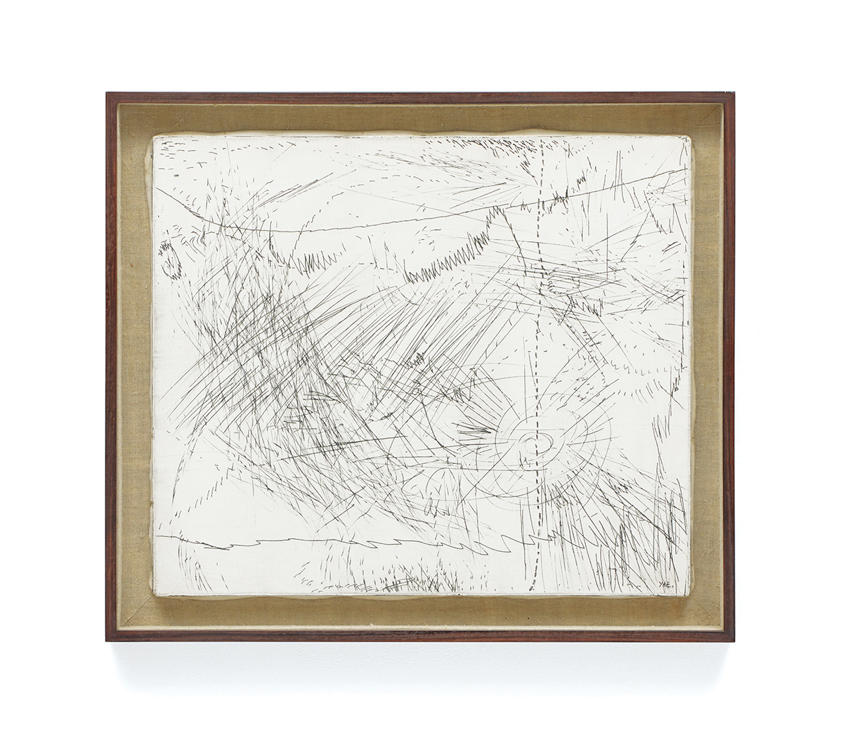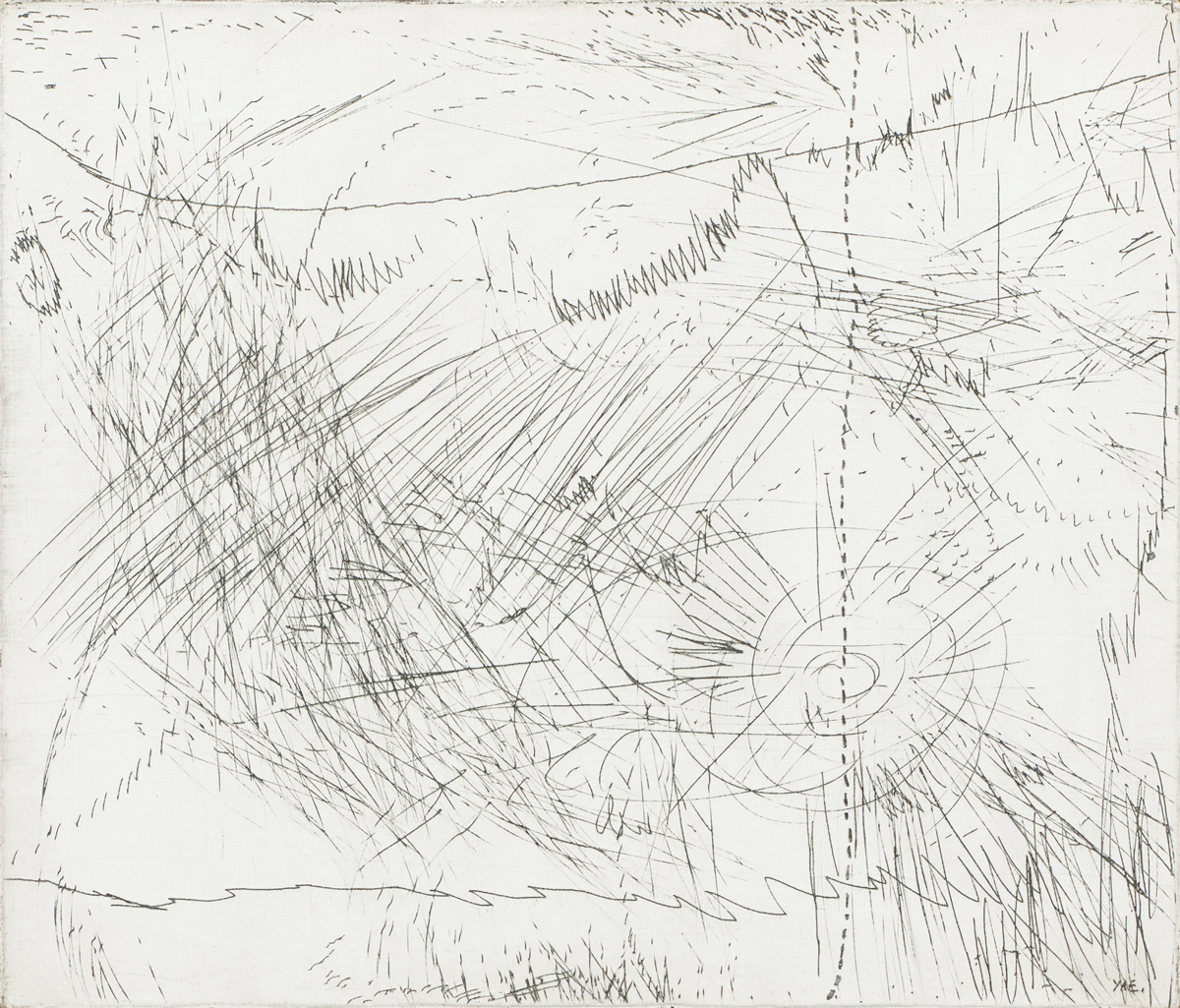 The painter Asano Yae (1914 - 1996 ) was born in the city of Suzuka in Mie Prefecture and began producing work during the mid-1930s, picking up paint brushes after serving in the military. Around the same time, Asano became close friends with Noda Riichi, a poet from the city of Tsu, and learned about the new art movements that were spreading across Europe and America from art magazines and books that were in Noda’s possession. However, whilst alive, Asano claimed to be an artisan (craftsperson), not an artist, pursuing methods of abstract expression whilst walking alone down Asano’s own unique path. Asano’s representative style is evident in the milky-white paintings from the late 1950s, in which innumerable sharp lines are drawn across the surface. Asano produced these characteristic works by scratching a stylus across the surface of half dried white paint that had been applied with rollers and paint knives. Once the paint was dry, black paint was applied to the entire surface and immediately wiped away. The painting was completed by the black remaining in the hollows of the surface that emerged as lines.