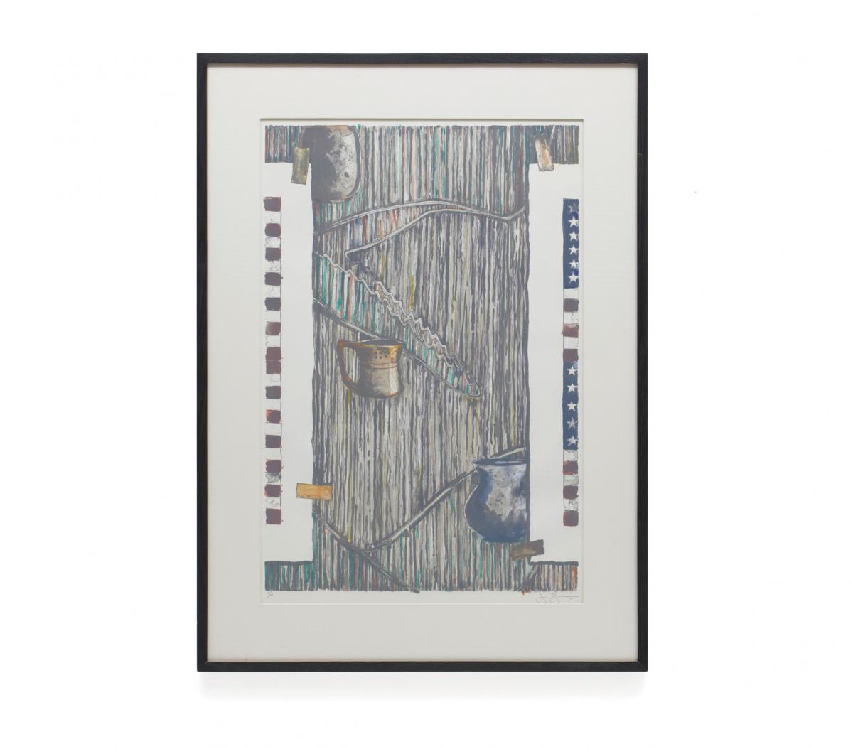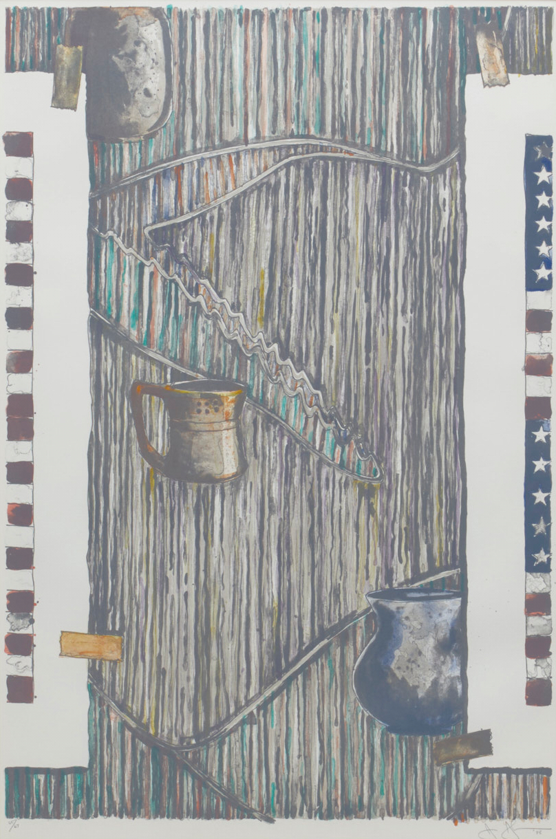 This work is said to depict the wall of Jones's studio, and on the far right hangs what appears to be Two Flags from No. 24. The seemingly floating vase is a work by George E. Ohr and part of Jones's own collection. In a work of the same title created in 1983 using encaustic (beeswax), a piece by Barnett Newman and others are also depicted in the upper right, making it a work that is at once autobiographical and a form of self-portrait.