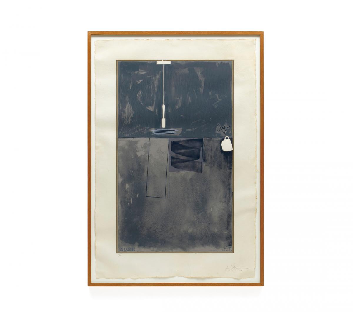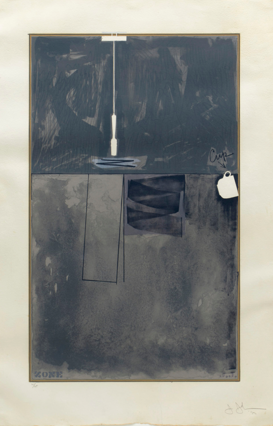 The original work was created in 1962 as an oil and encaustic (beeswax) painting on canvas, with brushes and cups suspended from it. The canvas is horizontally divided into two sections, with one half painted in oil and the other in encaustic, and such differences in tone and texture are also expressed in this print.