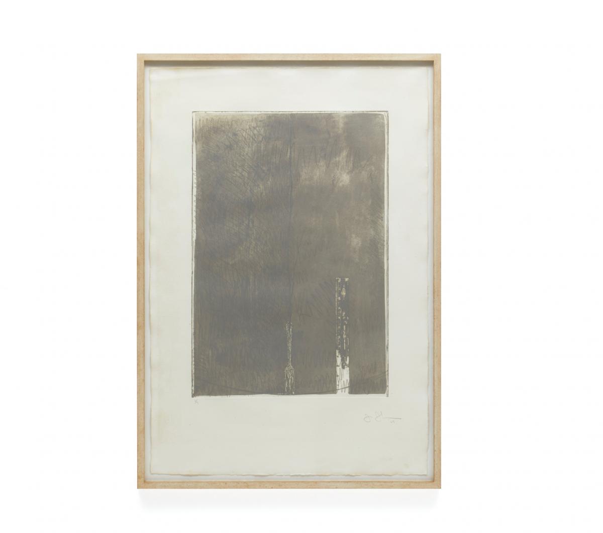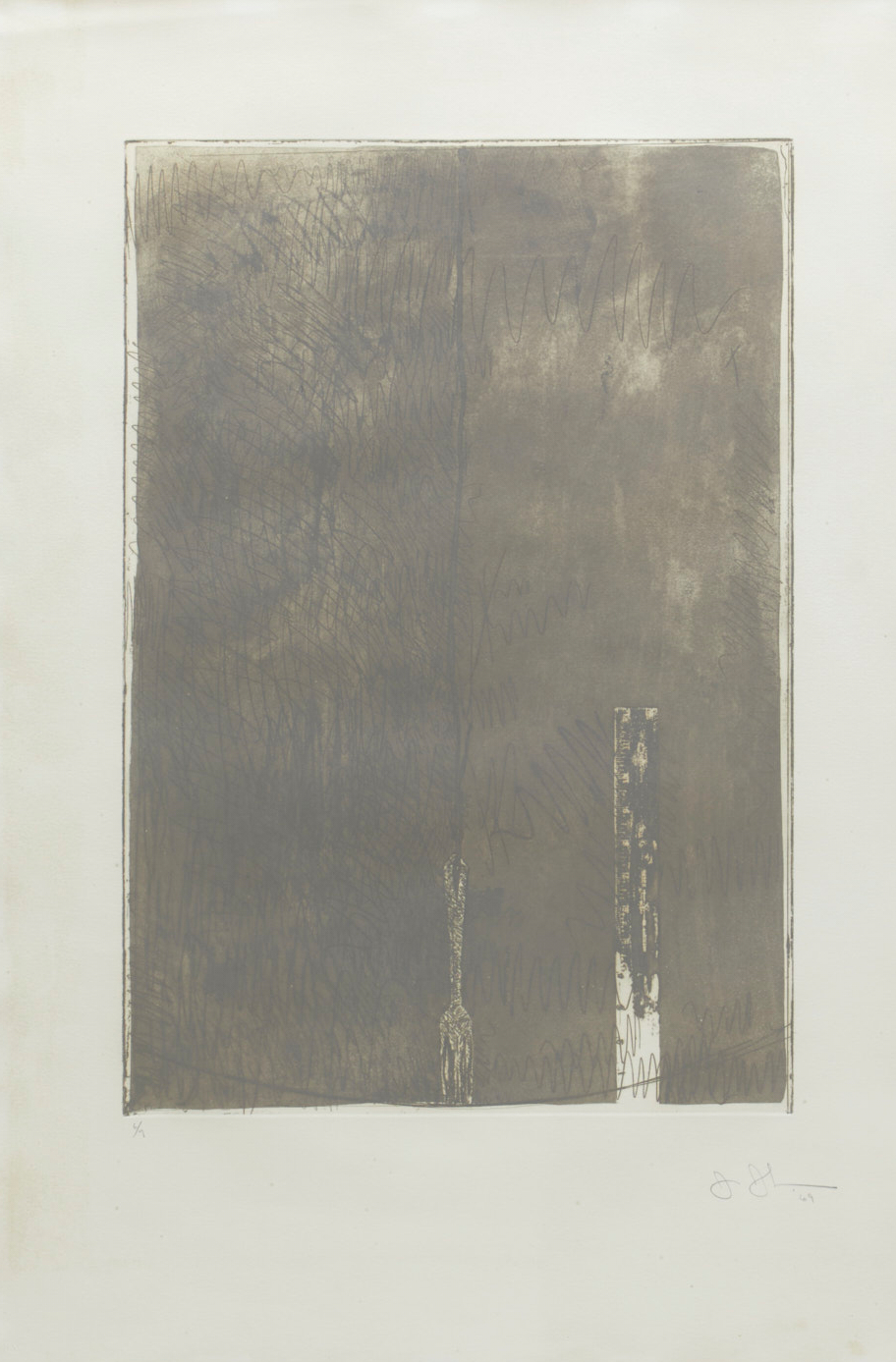 A ruler and a suspended fork. Both are everyday objects and motifs frequently employed in Jones's work. The cord-like element from which the fork hangs also serves to bisect the picture plane, with the density of the composition differing between the right and left halves. One would like to verify whether "the fork is 7 inches long," as stated in the text of No. 28, but the reversed numbers on the ruler become illegible somewhere around the "4."