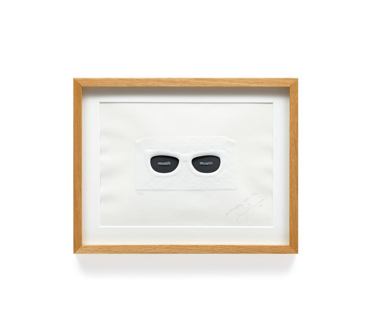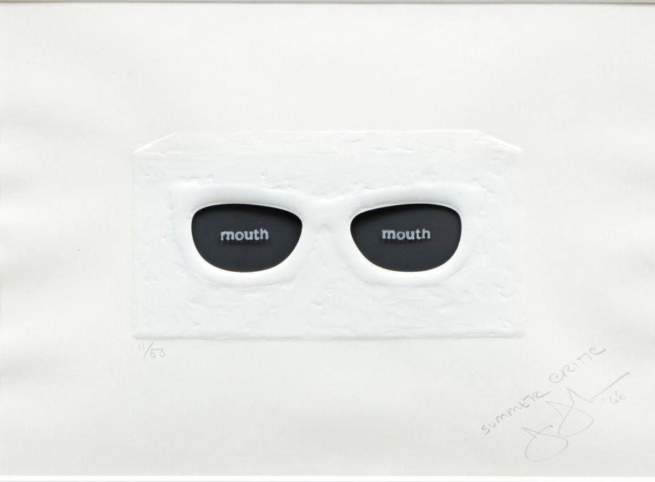 The title of this work incorporates the name of a piece by Marcel Duchamp. Johns published a review praising Duchamp when he was thirty years old, and Duchamp is one of the artists who had a significant influence on him. In a three-dimensional work from 1961, in which Sculp-metal (a synthetic material intended for amateur sculptors) was applied over plaster, the piece featured a pair of glasses containing an open mouth and a closed mouth. In this print, however, these are replaced by the single word "mouth" alone, resulting in a work of greater suggestiveness. The publisher was Shuzo Takiguchi, a leading art critic of modern Japan.
